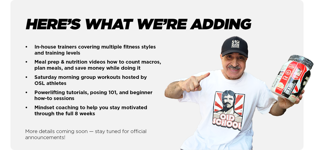 Use #OldSchoolLabs, #osltransformationchallenge, and #keepitoldschool in your posts. Don’t forget to tag OSL so we can find your progress!